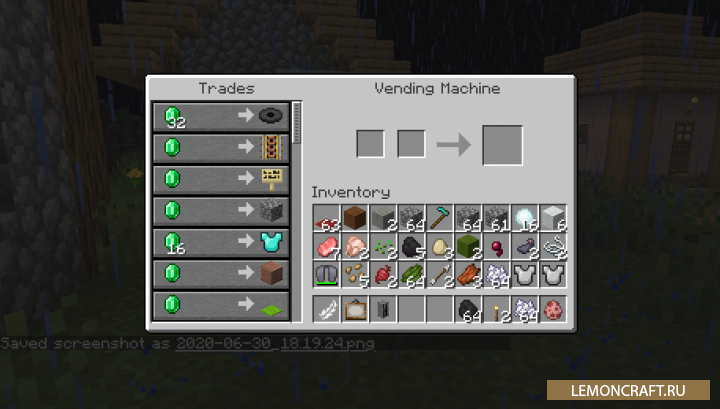 Мод на торговые автоматы Vending Machine добавляет в игру новые устройства, которые представляют собой небольшие магазинчике, где вы сможете приобретать различные предметы, а расплачиваться за них изумрудами. Те кто занимается созданием карт, смогут сами размещать торговые автоматы в нужных местах, с определенным перечнем предметов.